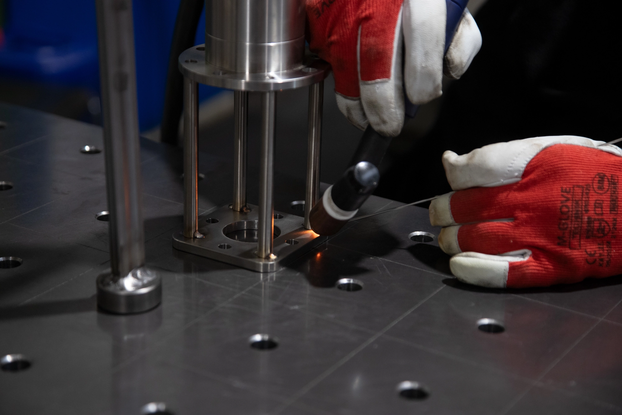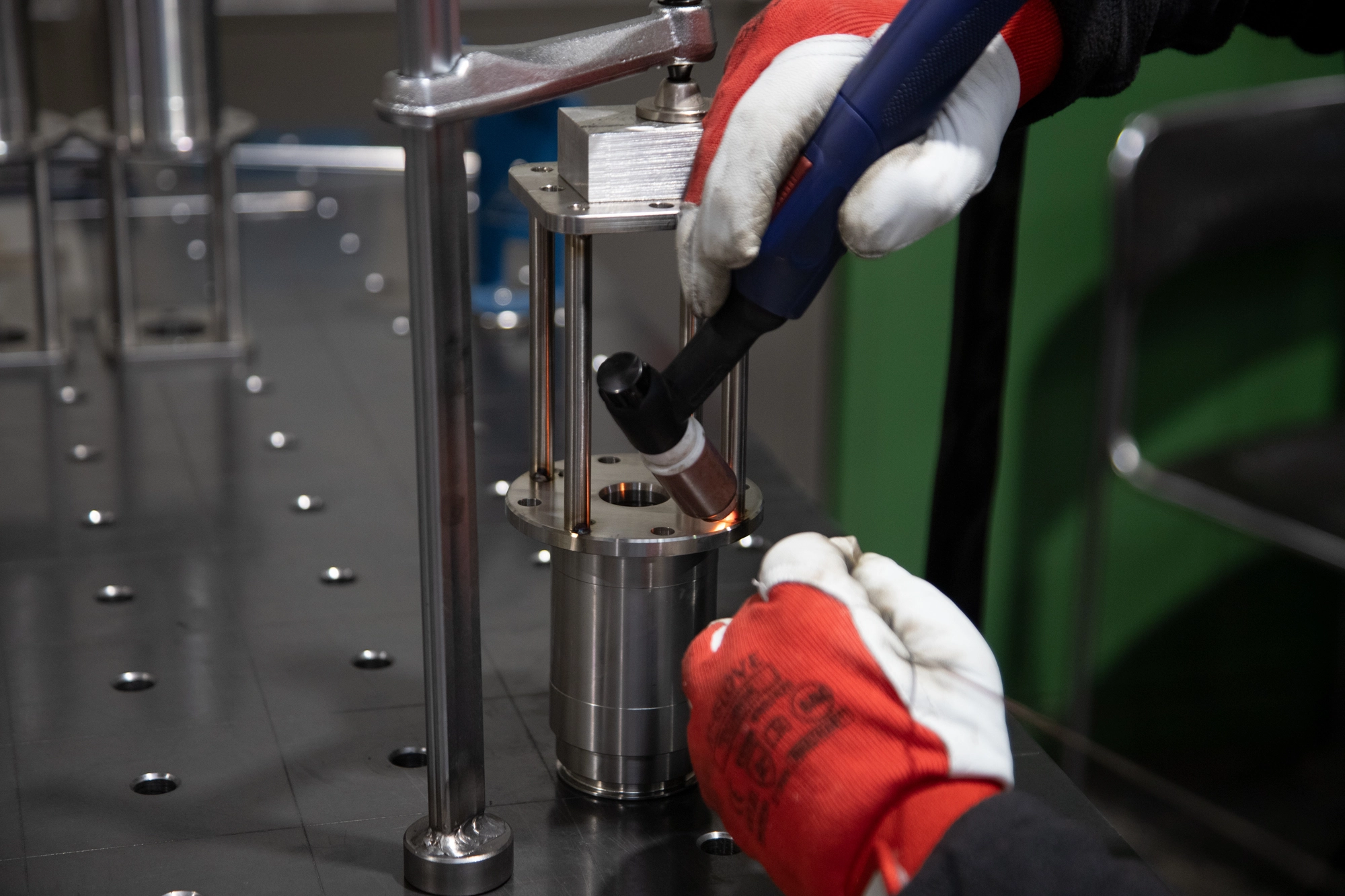 An ergonomic workspace equipped with a table with a positioning and clamping system, high-class welding sources and accessories enabling work with both thin-walled details and massive structures.